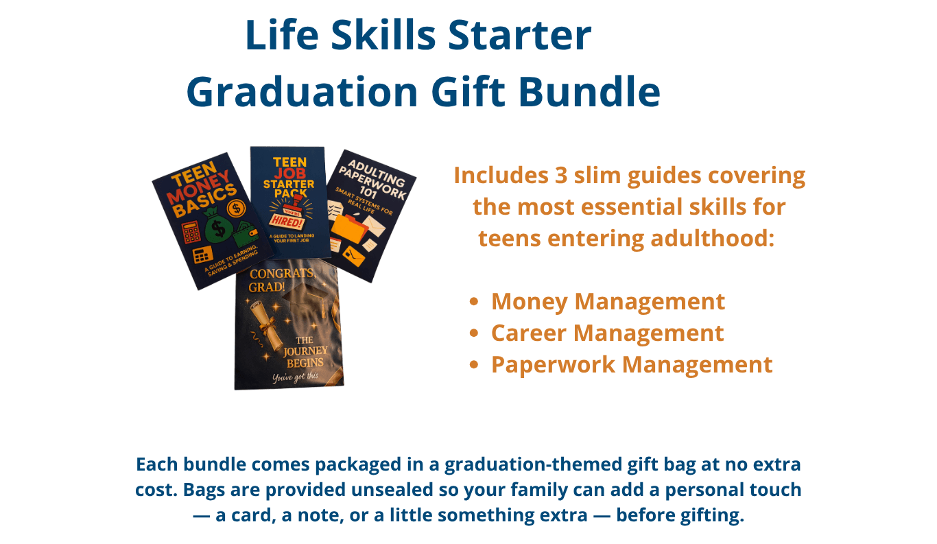 Each gift set includes carefully created life skills resources that help students navigate money, responsibility, everyday tasks ,and early adulthood with confidence.
